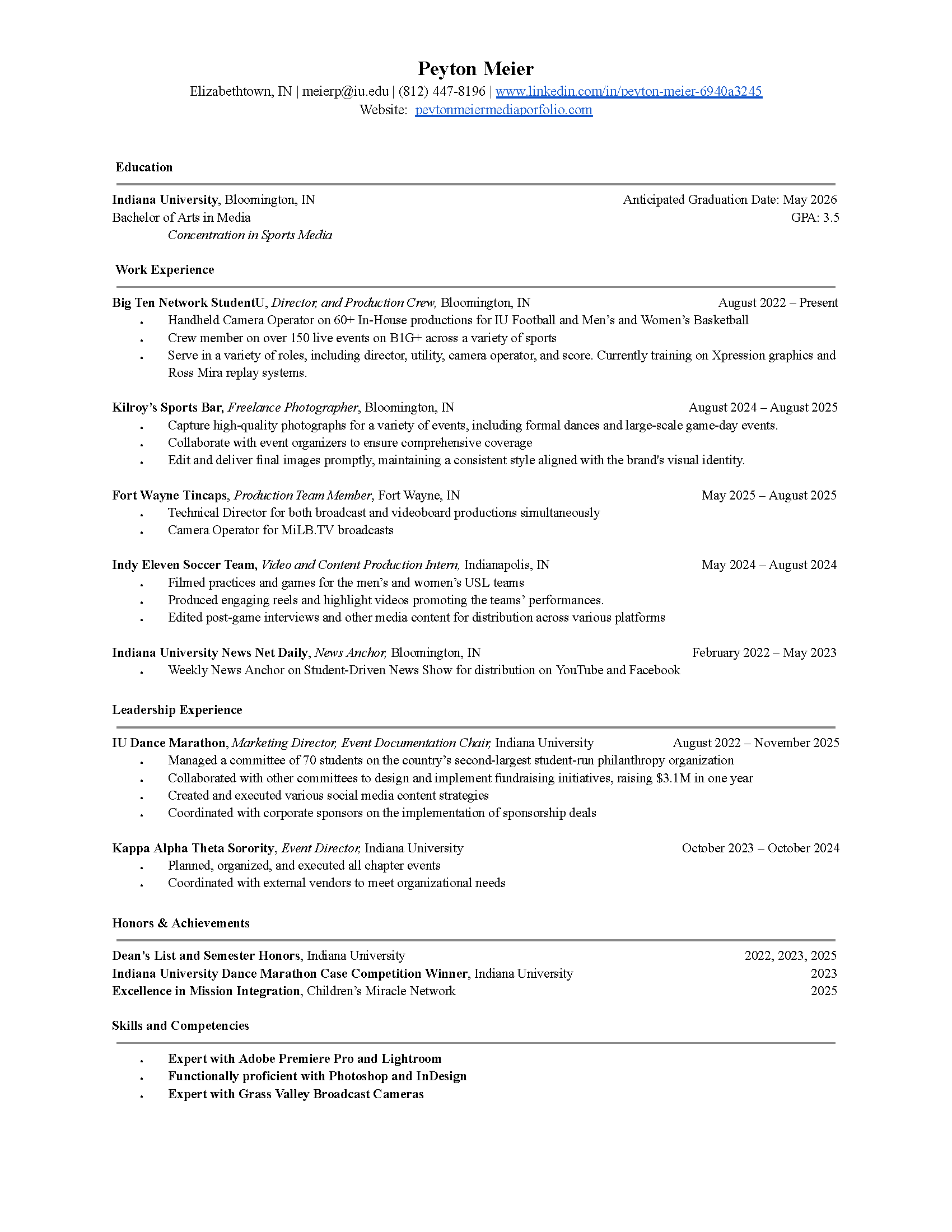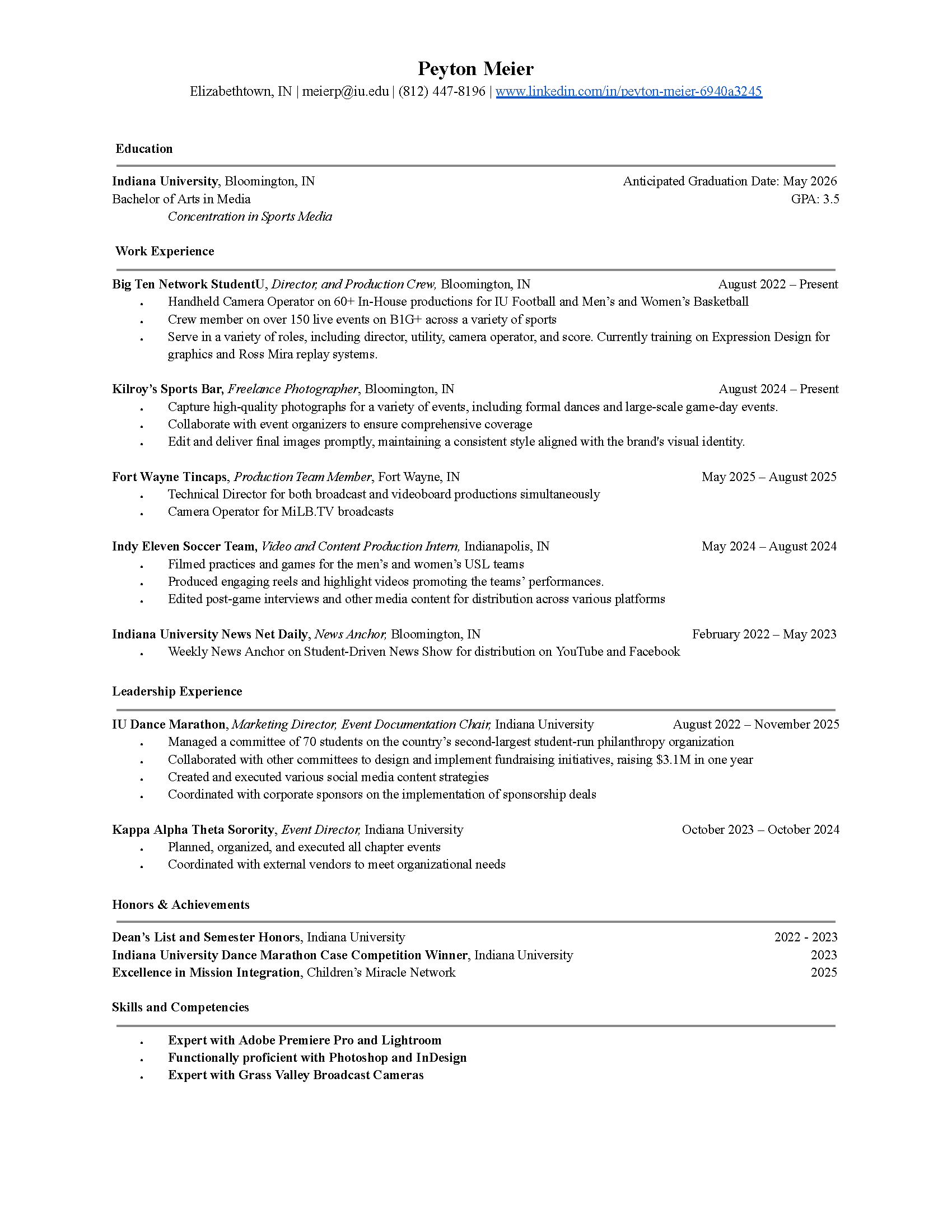 Hi, I’m Peyton Meier, and I’m graduating in May 2026. My passion for media began in middle school when I joined my school’s weekly news show, and it has continued to grow ever since. Through many amazing opportunities, I’ve gained valuable experience and discovered my love for sports broadcasting and production. I’m excited to keep learning, improving, and building my career in media.